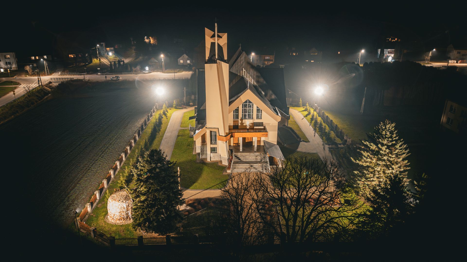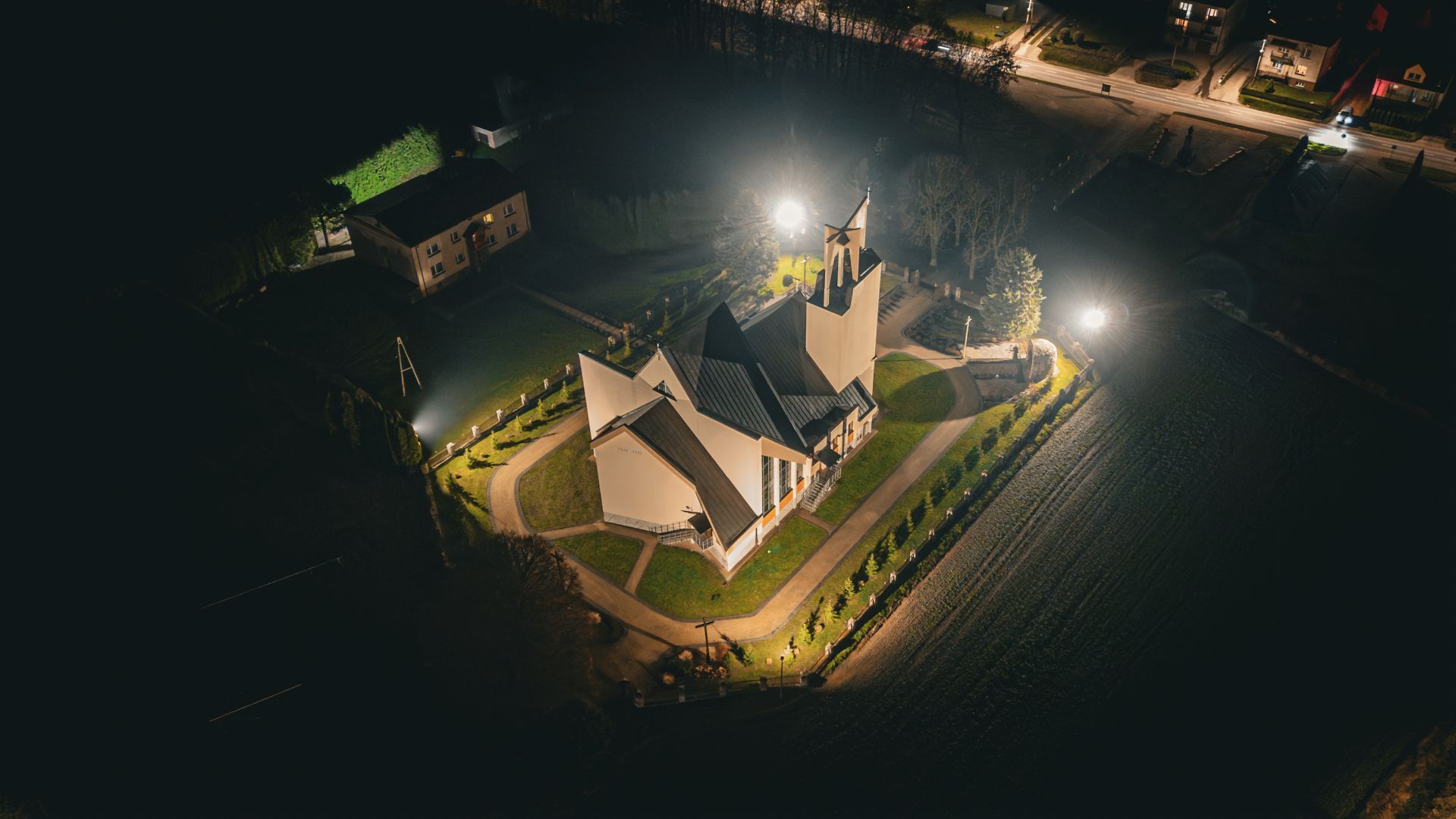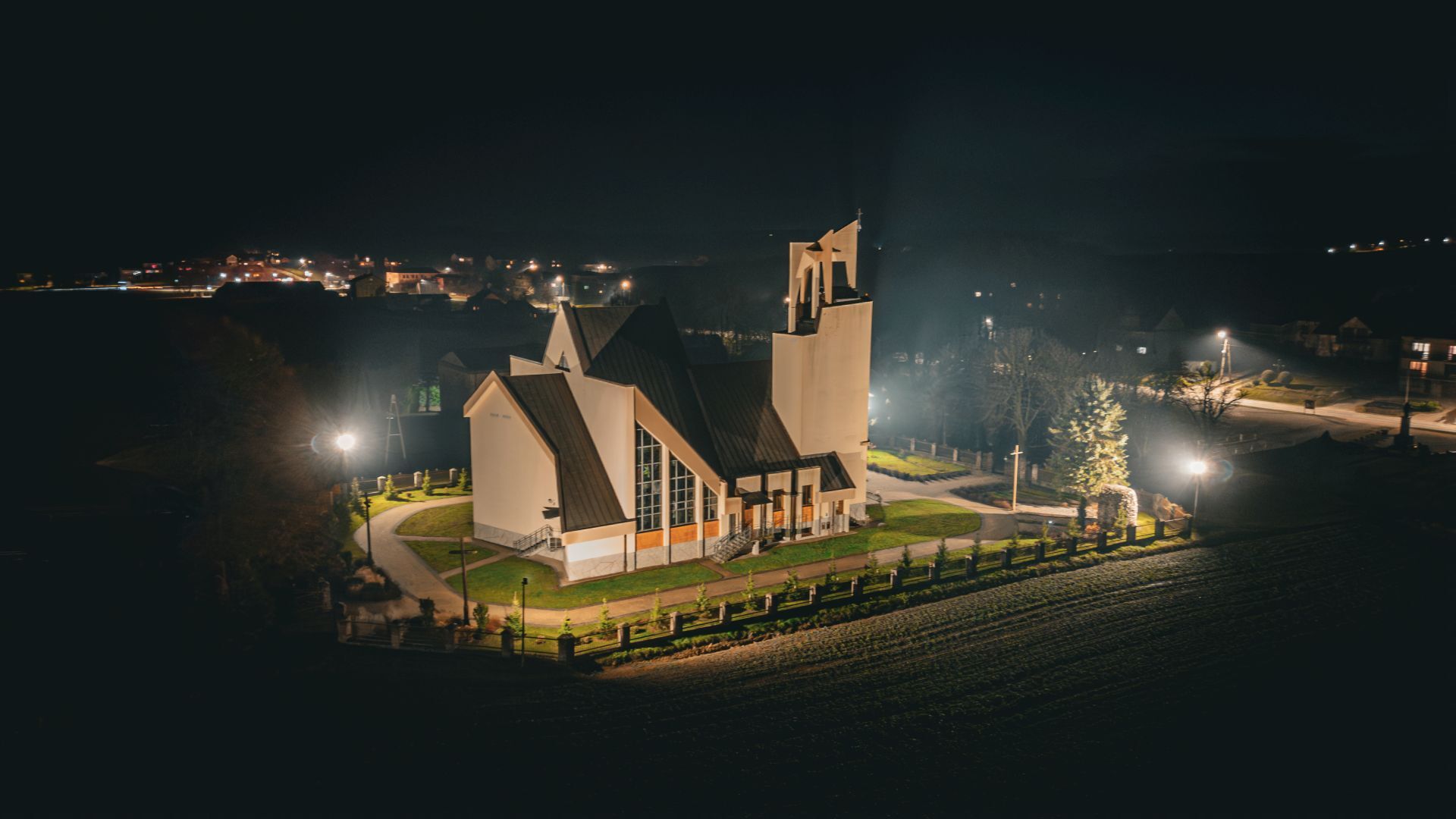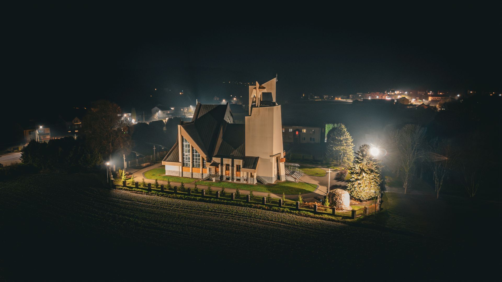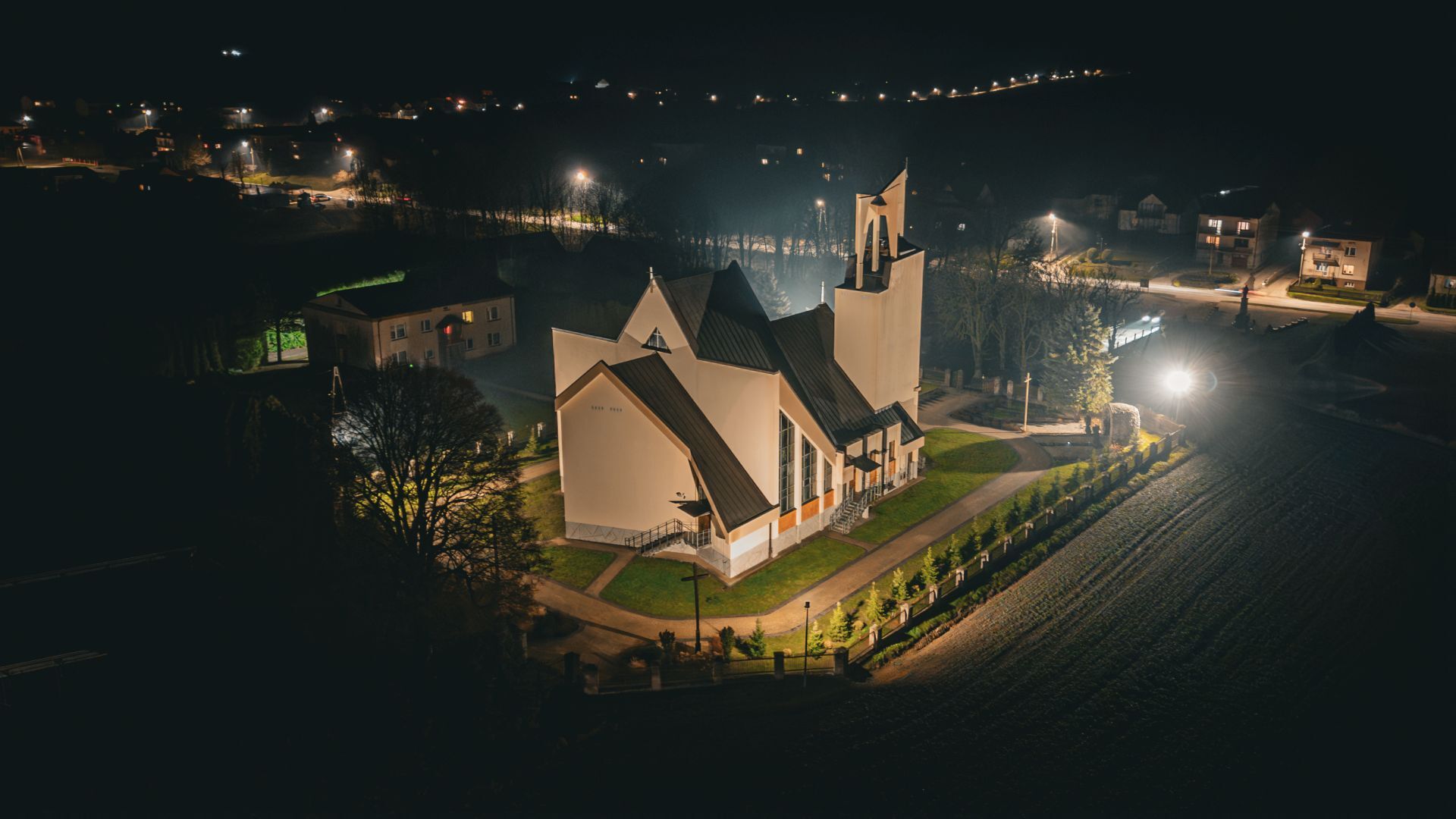 Na zdjęciu, które widzicie, główną rolę gra Kościół pw. Wniebowzięcia Najświętszej Maryi Panny. Za dnia jego nowoczesna, modernistyczna bryła z charakterystycznymi ostrymi liniami dachu wyróżnia się na tle wiejskiego krajobrazu. Jednak to właśnie w nocy budynek pokazuje swój "drugi charakter".