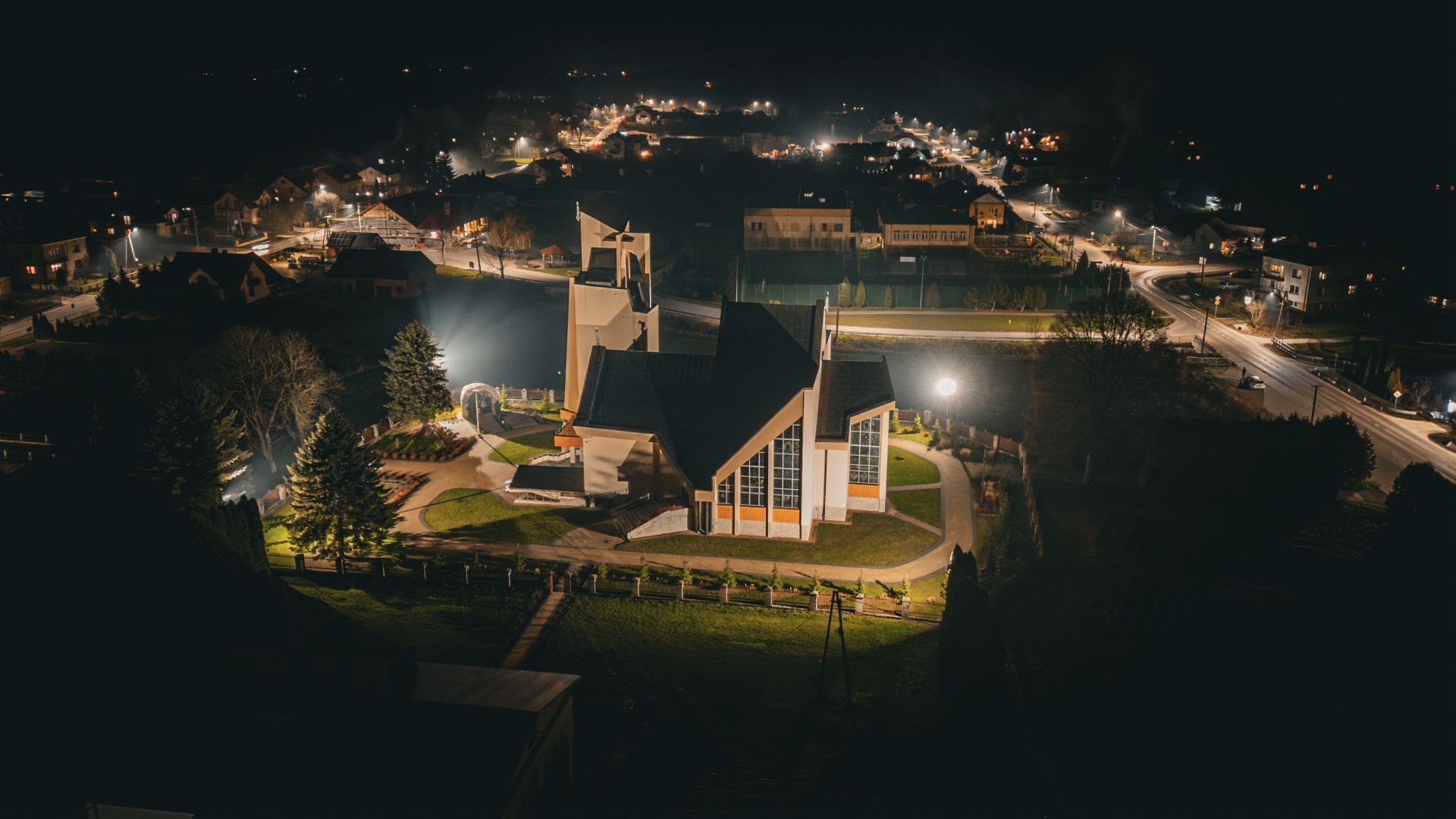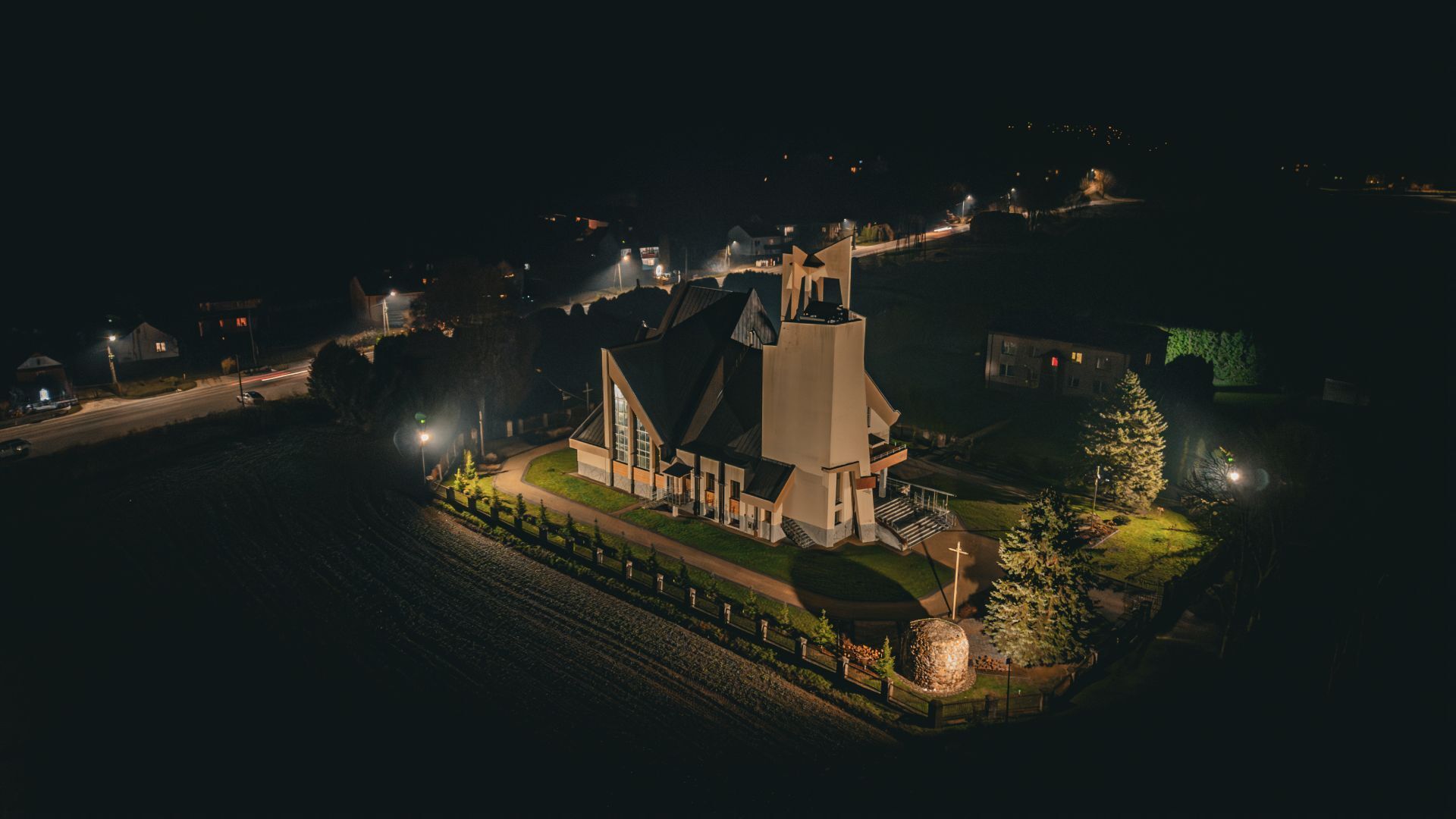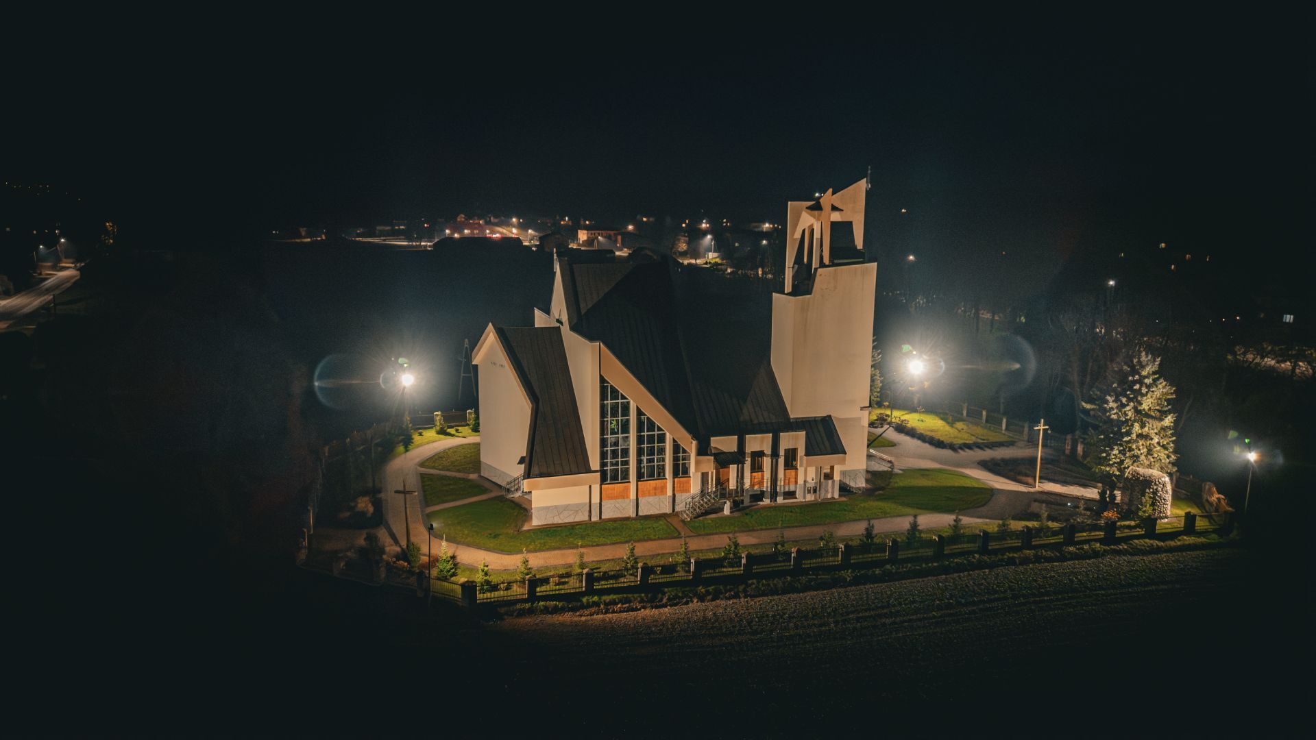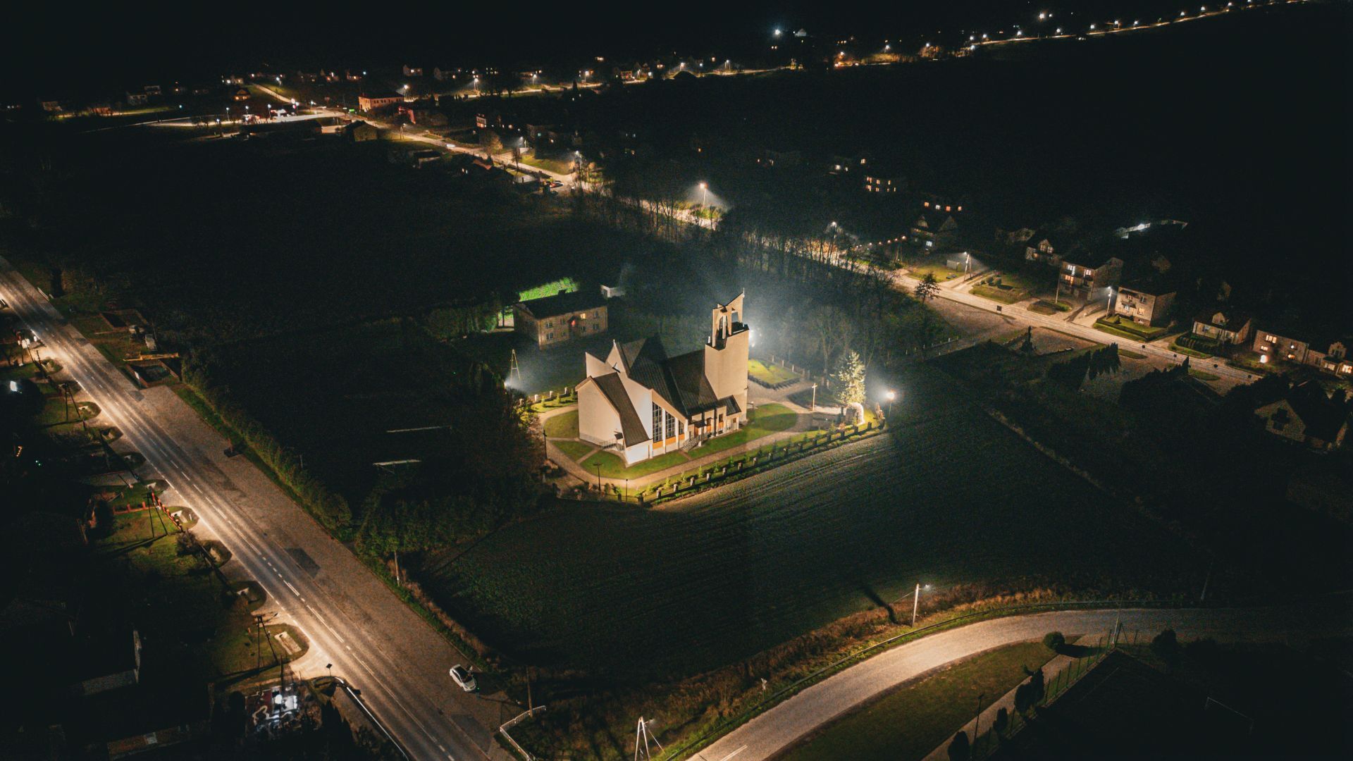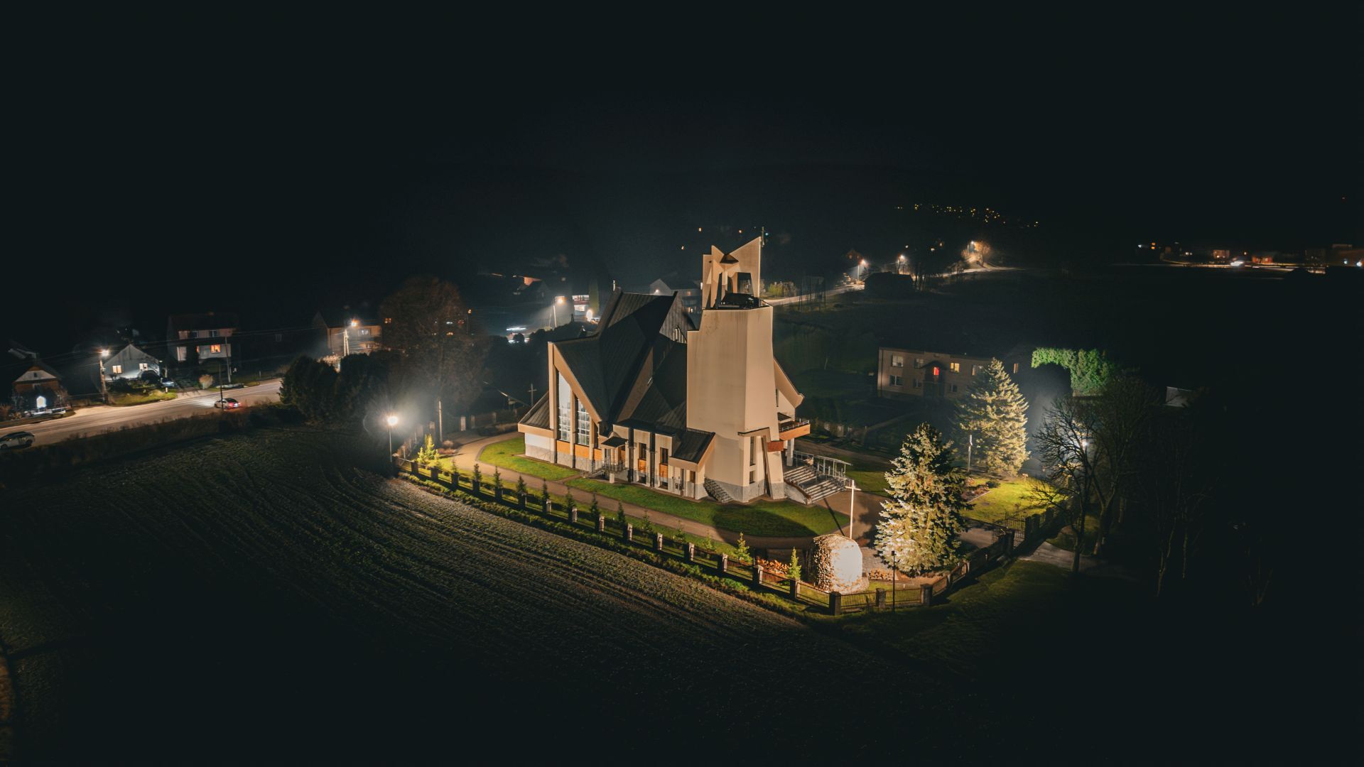 Na zdjęciu, które widzicie, główną rolę gra Kościół pw. Wniebowzięcia Najświętszej Maryi Panny. Za dnia jego nowoczesna, modernistyczna bryła z charakterystycznymi ostrymi liniami dachu wyróżnia się na tle wiejskiego krajobrazu. Jednak to właśnie w nocy budynek pokazuje swój "drugi charakter".