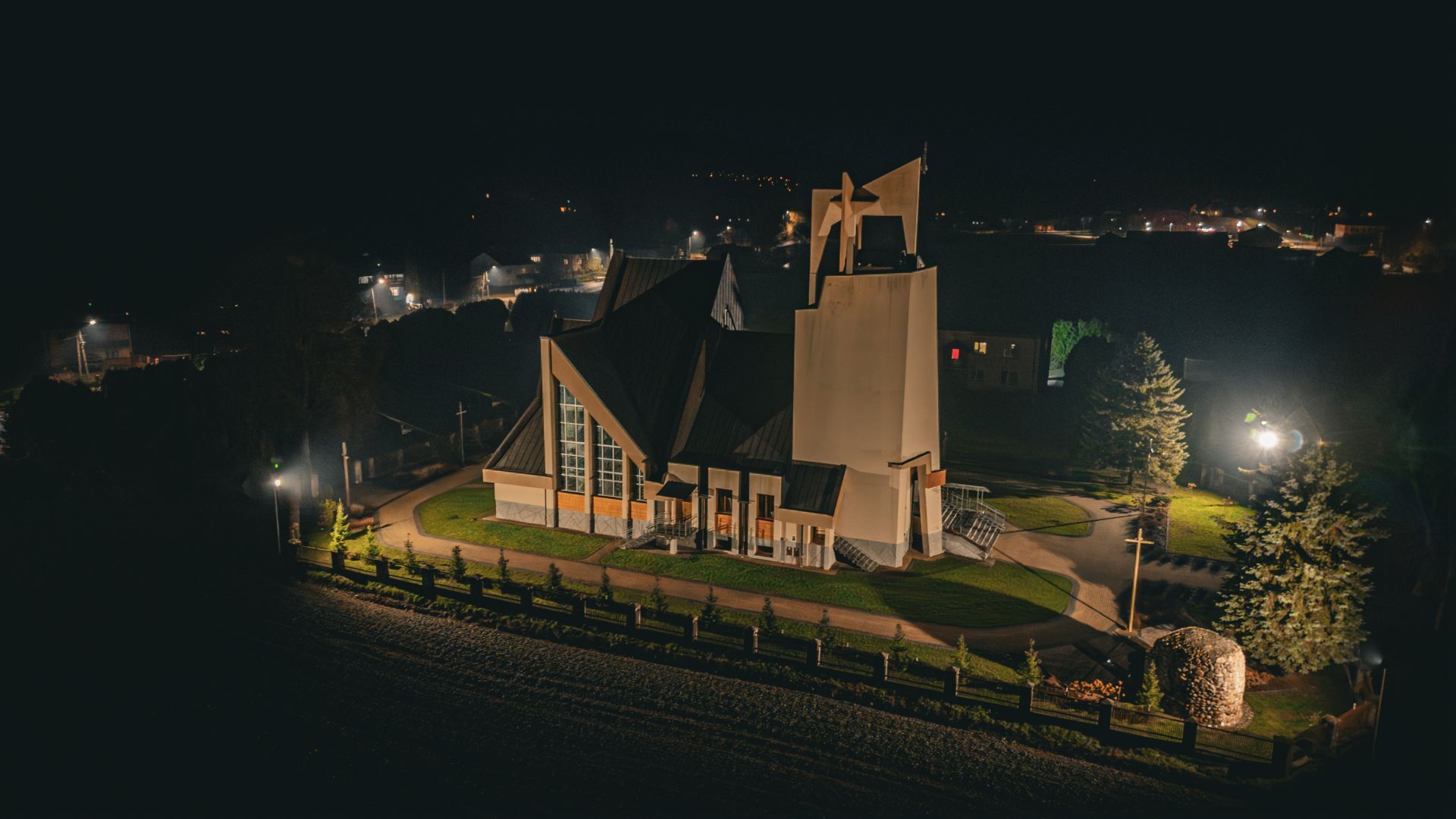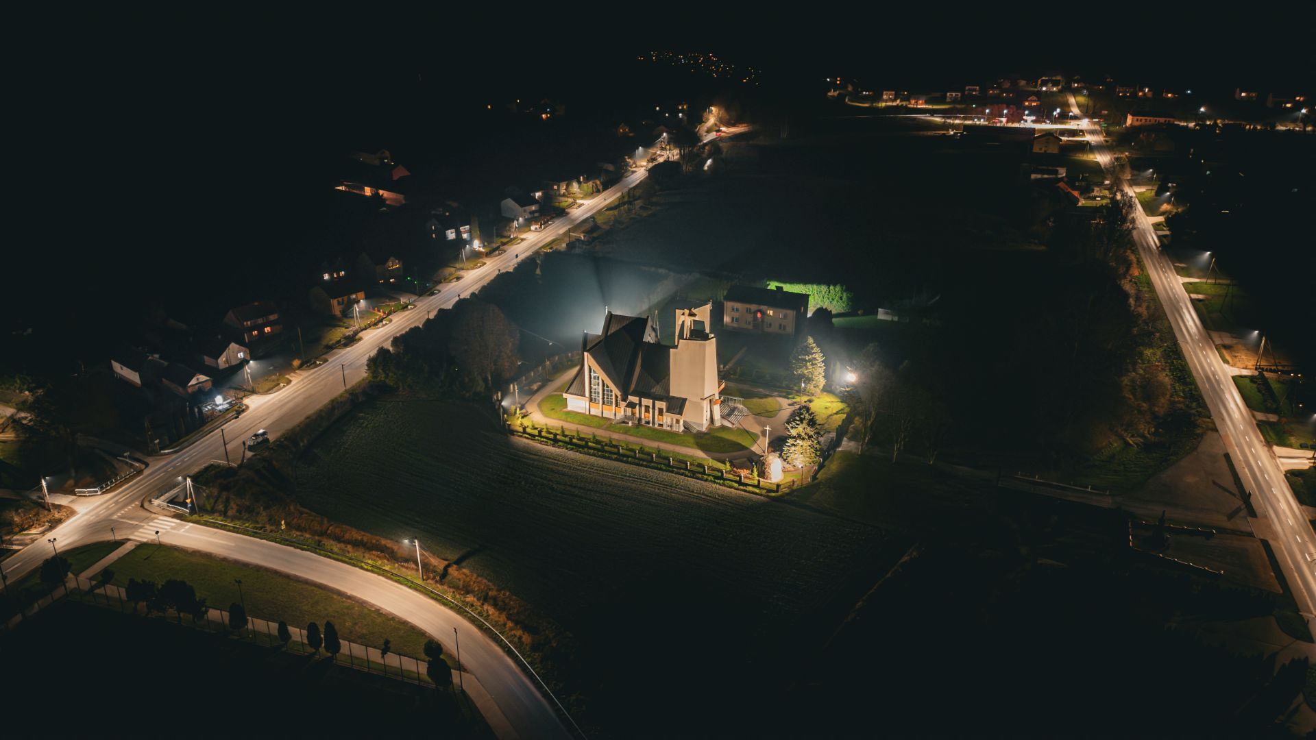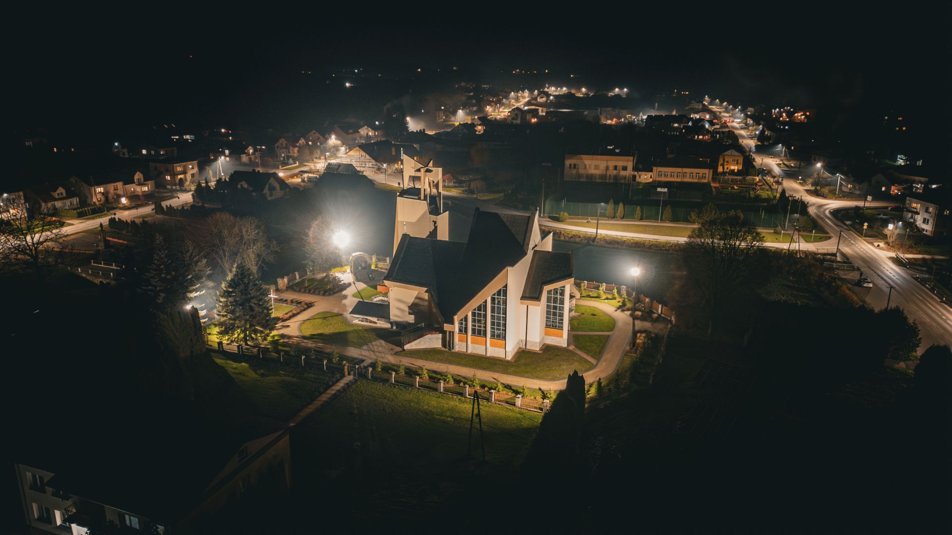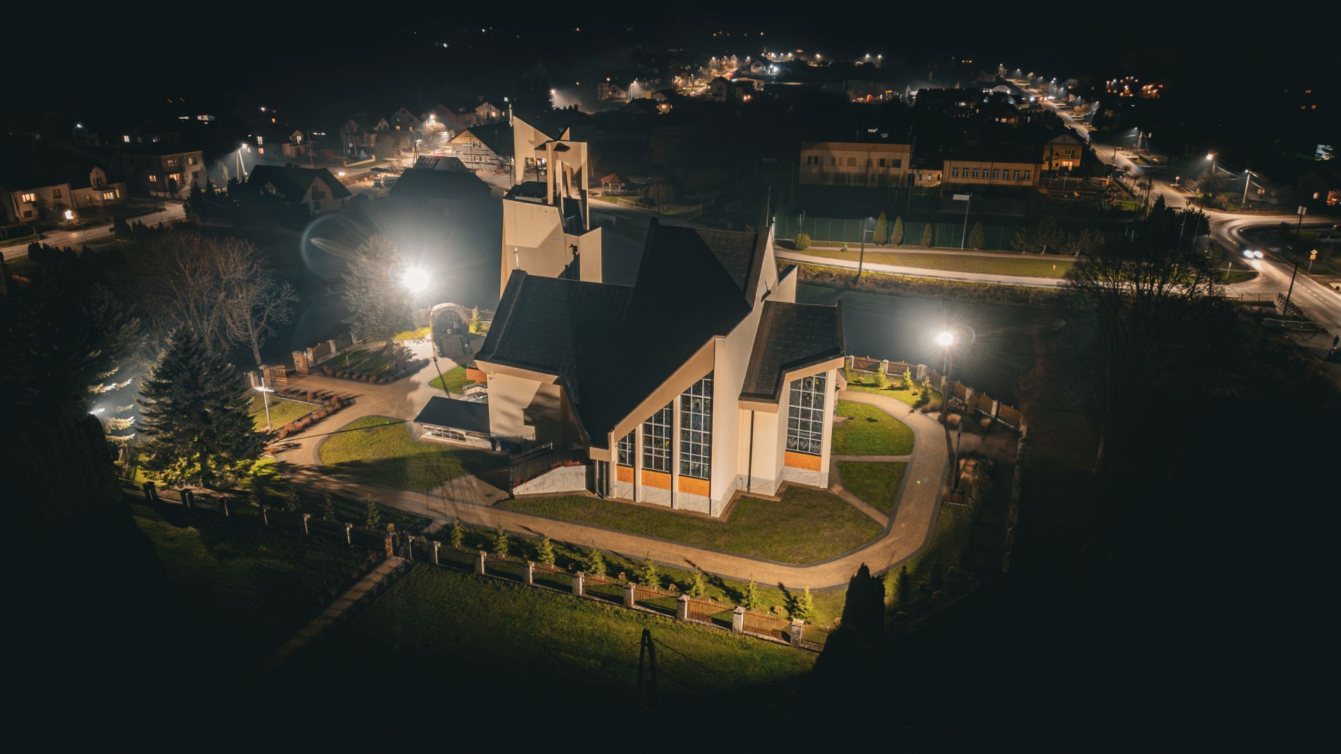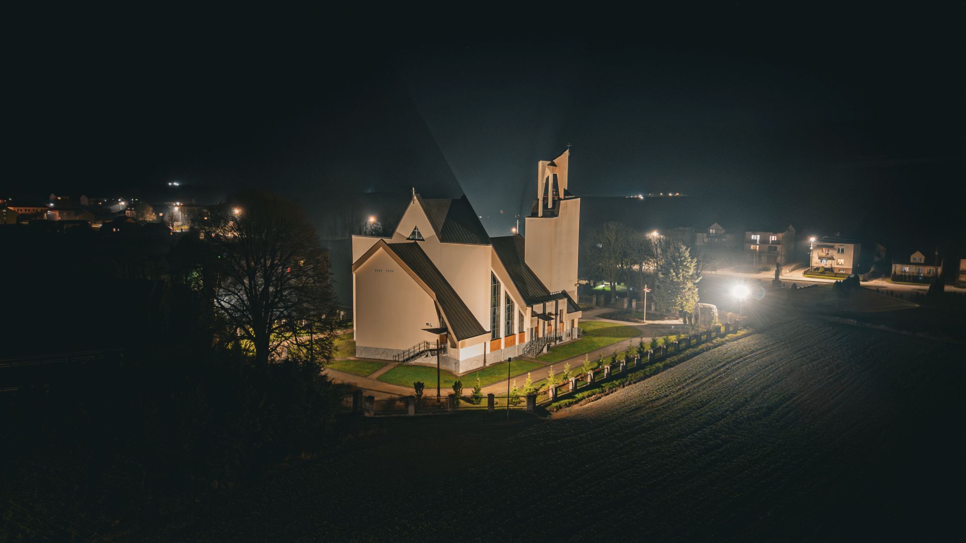 Na zdjęciu, które widzicie, główną rolę gra Kościół pw. Wniebowzięcia Najświętszej Maryi Panny. Za dnia jego nowoczesna, modernistyczna bryła z charakterystycznymi ostrymi liniami dachu wyróżnia się na tle wiejskiego krajobrazu. Jednak to właśnie w nocy budynek pokazuje swój "drugi charakter".