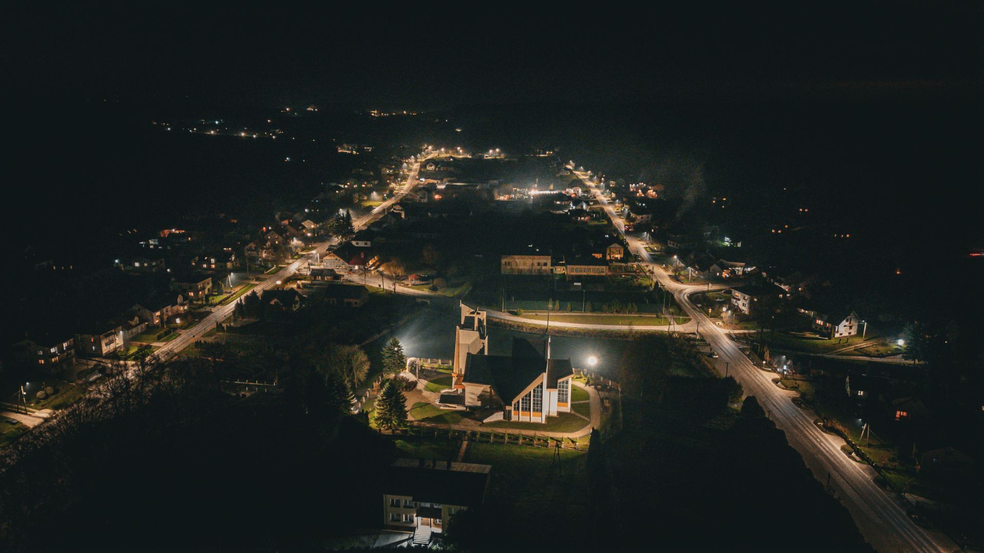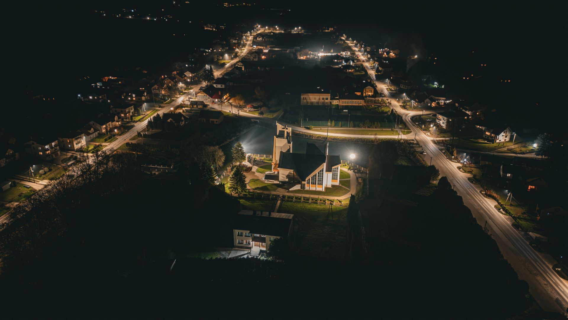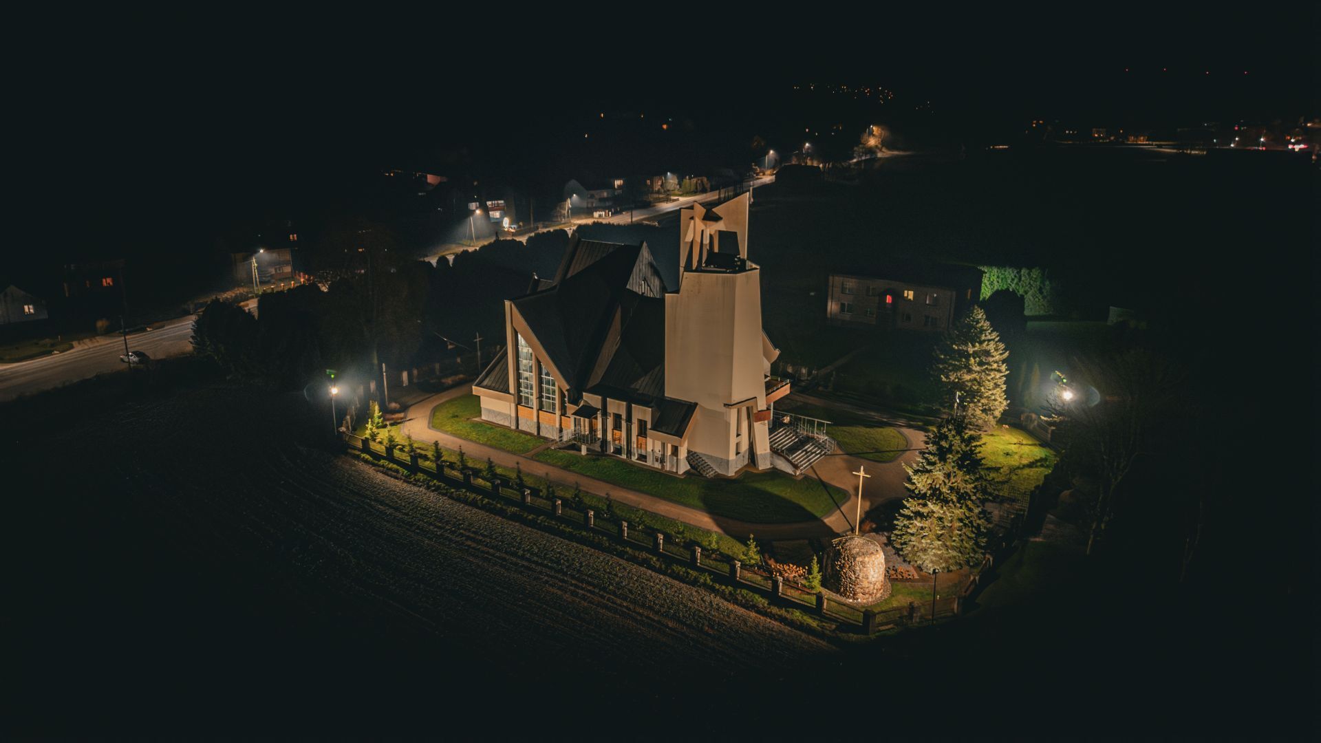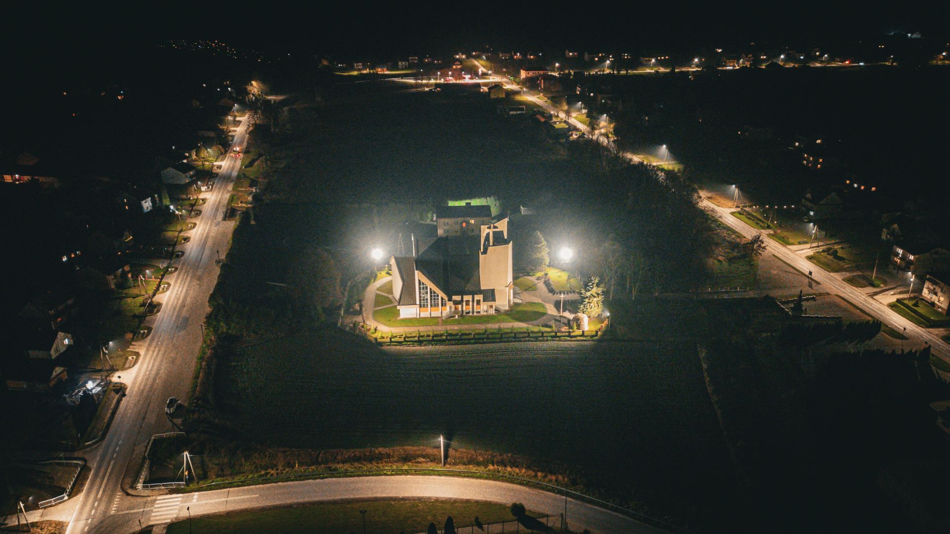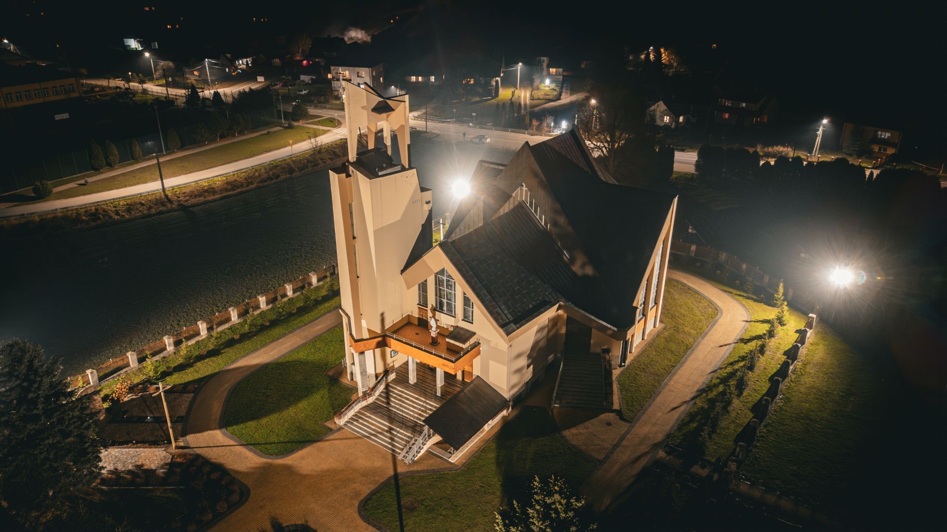 Na zdjęciu, które widzicie, główną rolę gra Kościół pw. Wniebowzięcia Najświętszej Maryi Panny. Za dnia jego nowoczesna, modernistyczna bryła z charakterystycznymi ostrymi liniami dachu wyróżnia się na tle wiejskiego krajobrazu. Jednak to właśnie w nocy budynek pokazuje swój "drugi charakter".