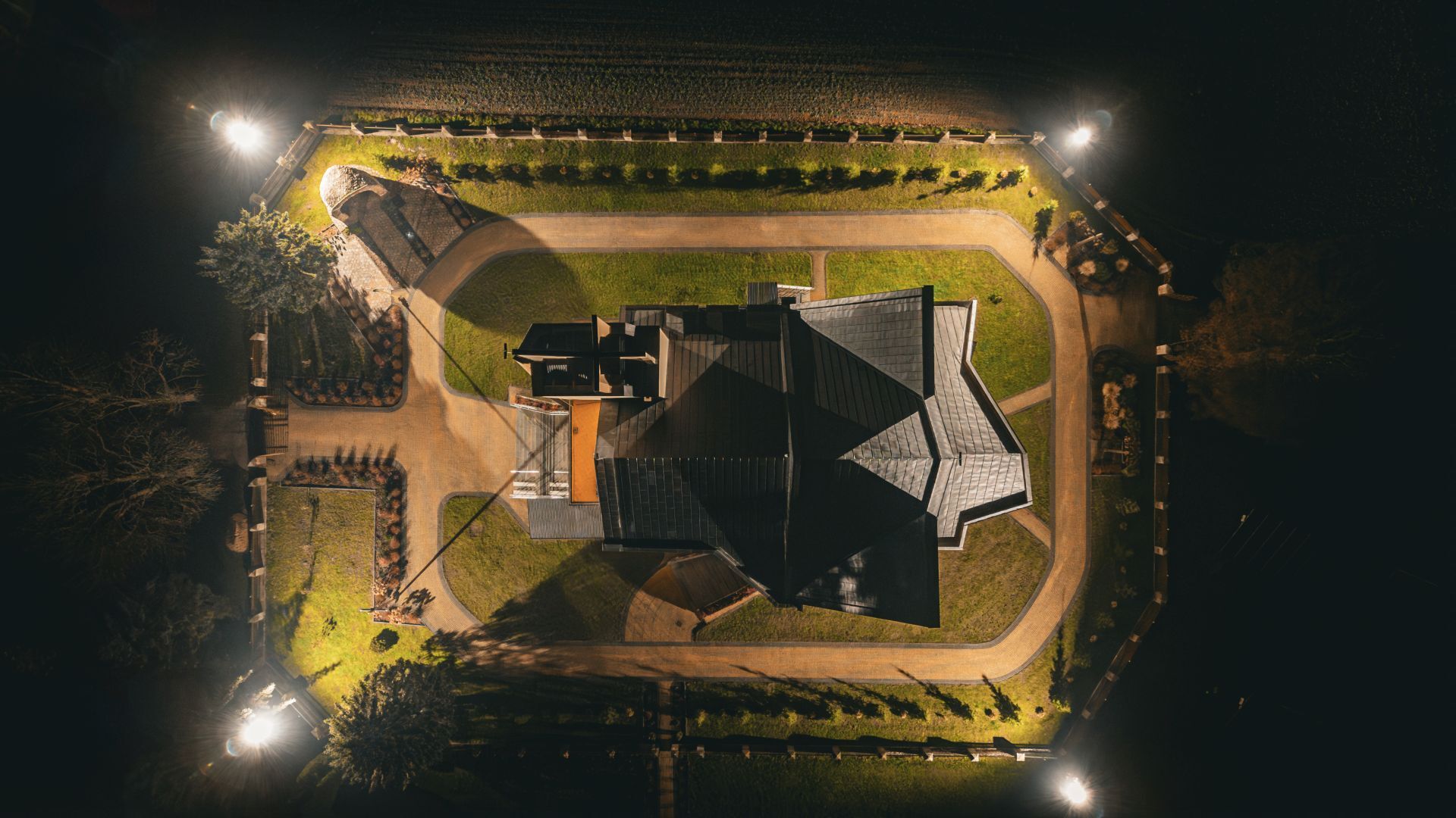Sztuczne oświetlenie wydobywa z mroku strzelistą wieżę i geometryczne załamania dachu, tworząc wrażenie, jakby budowla była latarnią morską pośród ciemnego "oceanu" pól uprawnych.